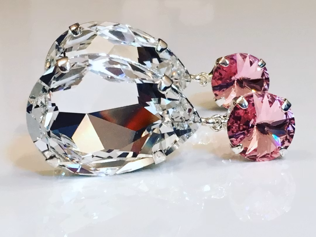 Gorgeous earrings in Crystal clear color and Light RoseThe round stone is a 12mm rivoli and the big drop is a fancy stone 20x30mmThe base of the earrings are in